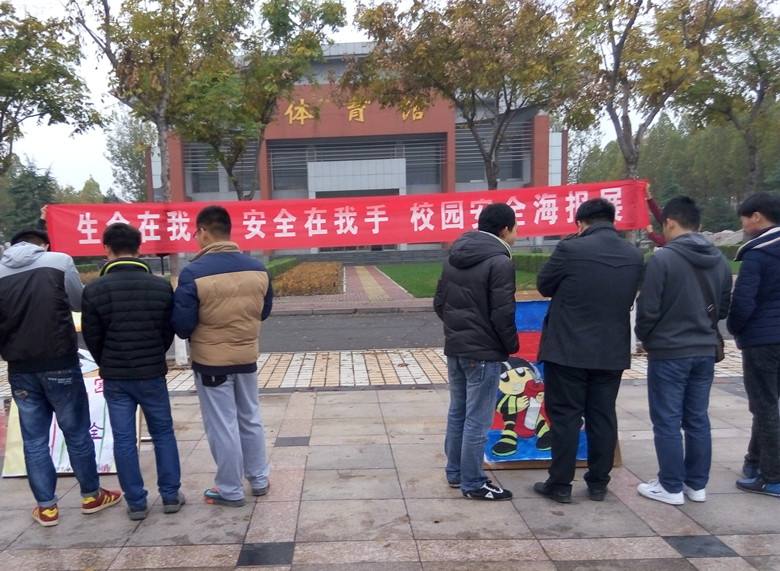 为了提高广大师生的安全防范意识,巩固公司安全教育成果,2015年11月16日下午3点30分,工商管理系员工会治保部发起了以“校园安全”为主题的海报展览会,海报在青年广场展出。