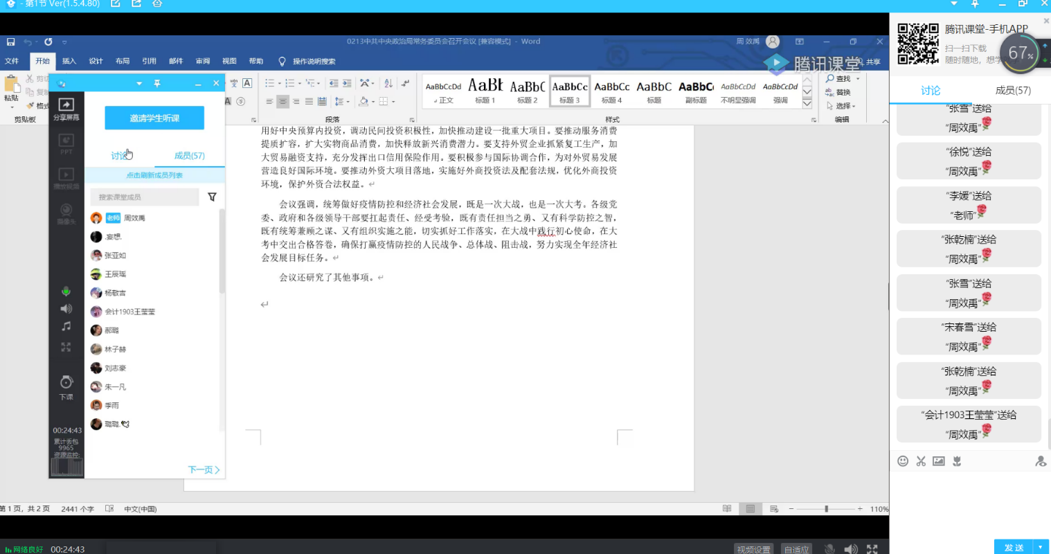 本次团课于19时30分准时开始,各班在团支书的带领下,利用QQ群课堂开展,首先,团支书带领同学们共同学习了总书记关于疫情防控的一系列重要讲话和指示精神。总书记强调:疫情就是命令,防控就是责任。各级党委和政府必须按照党中央决策部署,全面动员,全面部署,全面加强工作,把人民群众生命安全和身体健康放在第一位,把疫情防控工作作为当前最重要的工作来抓。随后,团支书与同学们进行连麦互动,对部分同学关于疫情防控问题进行提问,讲述了疫情期间发生在自己身边的对抗疫做出贡献的人,并且向大家分享自己的心得体会。本次团日活动于20时30分准时结束。
