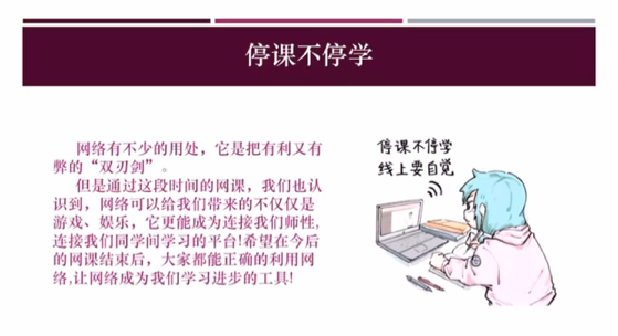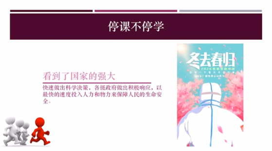 通过此次团课活动的开展,各班团支书带领本班同学积极响应,即使在全国人民共同抗击疫情的特殊时期,也阻挡不了同学们学习的积极性。停课不停学,学习不停步,只要我们众志成城,万众一心。日出,脱胎于最黑暗的夜,无论过程如何凶险,请相信祖国,光明终将来!