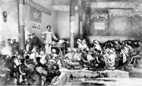 1929年12月底,中国共产党红军第4军第九次代表大会在福建省上杭县古田召开。古田会议在党的历史上以自我革命的方式纠正了党和红军自身存在的问题,使正确的建党建军原则逐步得以实行,显示了我们党极强的自我纠错和自我修复能力。图为油画《古田会议》。