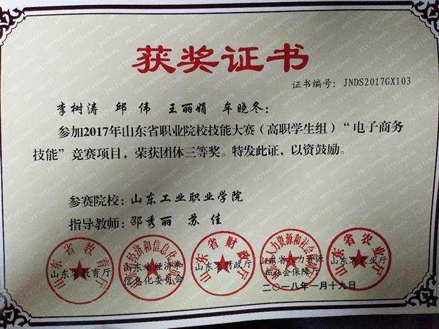 2017年11月11日,山东省职业院校技能大赛(高职组)“电子商务技能”赛项在山东商务职业公司举行,经过7个小时的竞技拼搏,大赛于当晚5时30分结束,山东工业职业公司工商管理系李树涛、王丽娟、邱伟、牟晓东4名同学组成的代表队在比赛中发挥出色,获得三等奖。