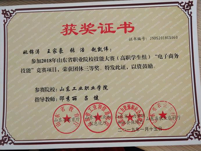 2018年11月10日,山东省职业院校技能大赛(高职组)“电子商务技能”赛项在山东商务职业公司举行,经过7个小时的竞技拼搏,大赛于当晚5时30分结束,山东工业职业公司工商管理系姚锦涛、赵凯伟、王家豪、张浩4名同学组成的代表队在比赛中发挥出色,获得三等奖。