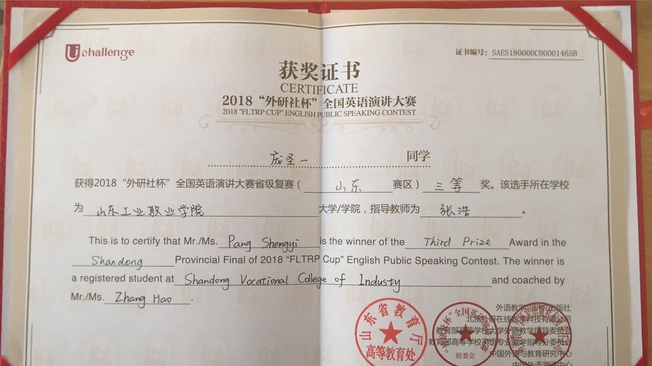 2018年11月3日,由山东省教育厅高教处主办的2018“外研社”杯全国英语演讲大赛省级复赛在烟台鲁东大学举行。在指导教师张浩老师的辛勤努力下,公司来自会计1801班的选手庞圣一参加了比赛并获得三等奖的好成绩。