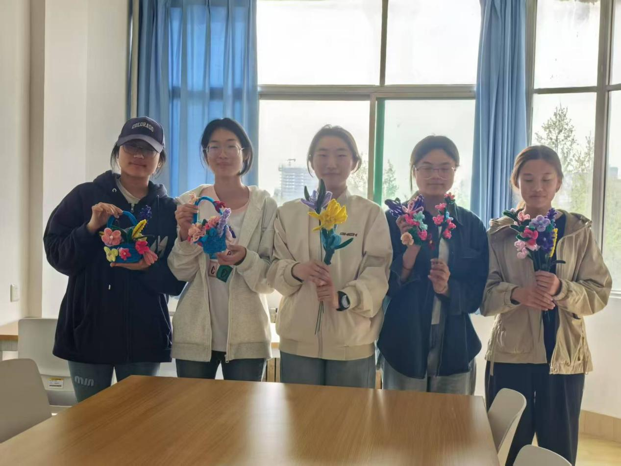 本次活动分为理论讲解与实践操作两个环节。青晨社团通过图文资料与视频展示,系统展示了绒花制作技艺发展脉络及其文化内涵。在实践环节,社团采用分组指导模式,由经过两周专项培训的志愿者演示"捻丝""勾条"等基础技法,指导学员完成花瓣塑形与色彩搭配,成功制作山茶、牡丹等传统造型作品20件。