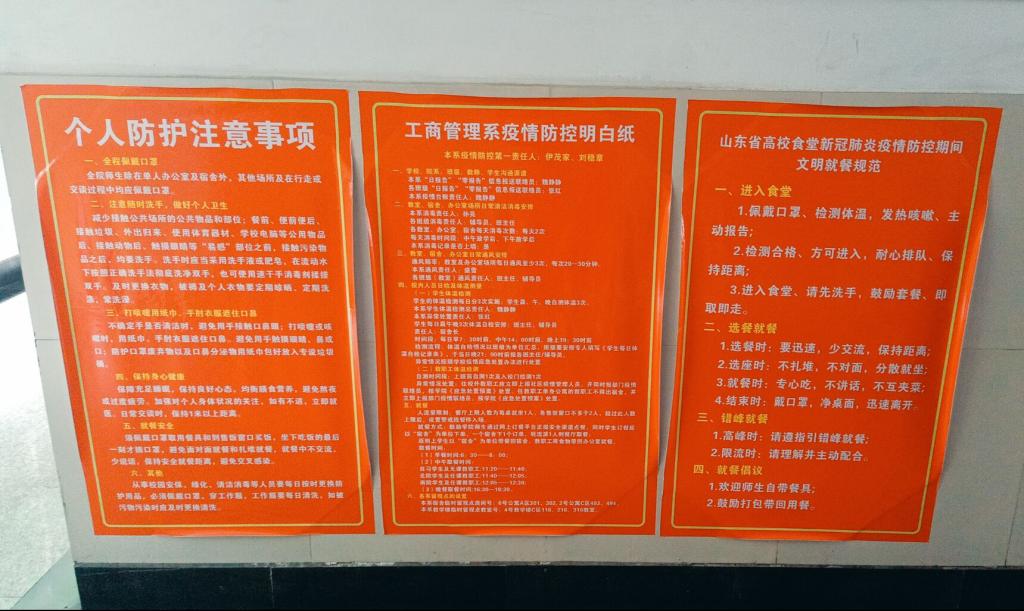 Bevictor伟德官网自律部、权益部每天在教学楼门口分早中两次测量体温,要求同学们之间保持1.5米距离并按规定佩戴口罩进入教室。教学楼门口张贴了“个人防护注意事项”、“Bevictor伟德官网疫情防控明白纸”、“山东省高校食堂新冠肺炎疫情防控期间文明就餐规范”等注意事项。每天放学后公司和教室进行消毒,通过卫生大检查的方式督促同学们自觉的维护好身边的学习和生活环境。为了确保防疫工作的开展,进出宿舍门口有专业人员提示同学们带好口罩、体温监测等行为。等同学们走出宿舍后,宿管阿姨进行宿舍走廊消毒打扫。为了减少大量聚集,Bevictor伟德官网取消了晚自习和跑早操活动。同学们积极配合Bevictor伟德官网开展的防护工作。