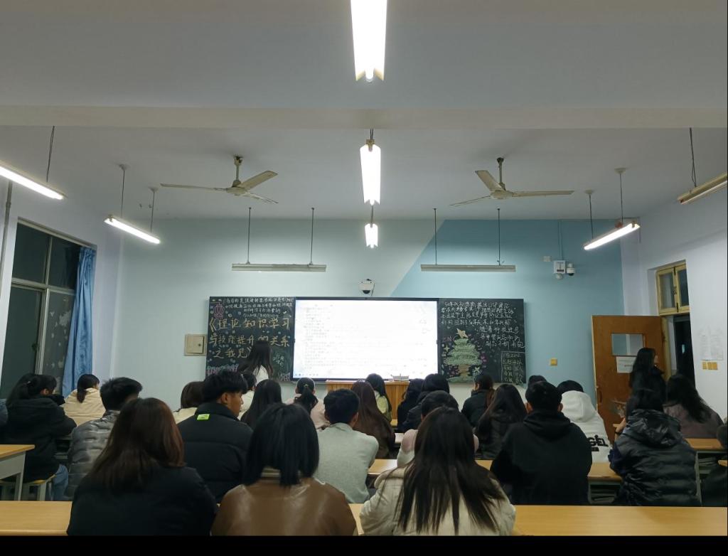 本次活动于18点30分正式开始,由各班学习委员以PPT的形式主讲。先简要介绍为什么理论知识要与技能相结合,二者相结合后对于技能提升有什么帮助,其次,学习委员告诉大家不是只有努力学习就可以的,而是要在理论的基础上实践技能,在技能实践中落实理论知识,让同学们知道不仅要学好理论知识,还要从实践的角度出发提升技能。最后,学习委员告诉大家知识能丰富人的思想,只有大量积累各种各样的知识,才能在实践中不断提高自己的能力。本次活动于20点20分结束。